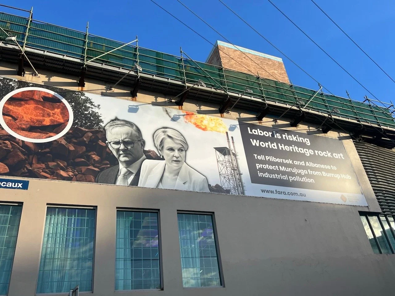 Friends of Australian Rock Art have installed a 19-metre billboard in Environment Minister Tanya Plibersek’s electorate, urging her and Prime Minister Anthony Albanese to protect the ancient Murujuga rock art from Woodside’s Burrup Hub pollution.